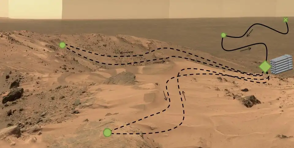 Perseverance will travel around, checking out different kinds of rocks and dirt samples, and storing those most worth studying. The drawing on the photo above shows how the rover may search, collect, and store samples.